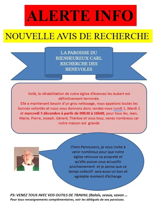 Dans le cadre de la prochaine réouverture de l'Eglise Saint Rémi d'Avesnes Les Aubert, après plus de 2 mois et demi de travaux, les bonnes volontés sont invitées les 1er, 2 et 3 décembre pour participer au nettoyage de l'Eglise ! Soyez Nombreux