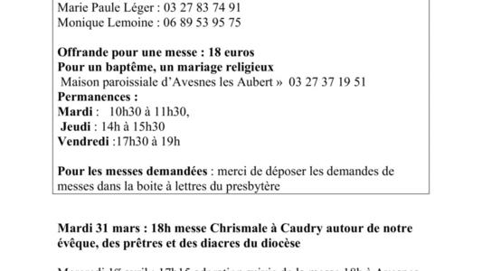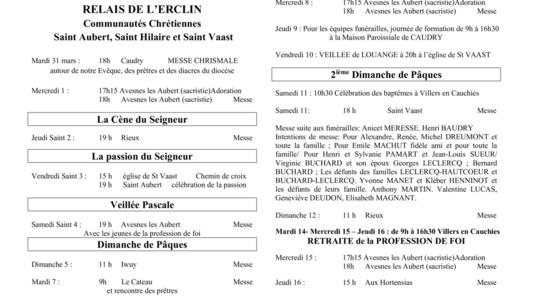 Dates, Lieux et Horaires des Messes et Temps Forts en AVRIL 2026 - Relais de l'Escaut